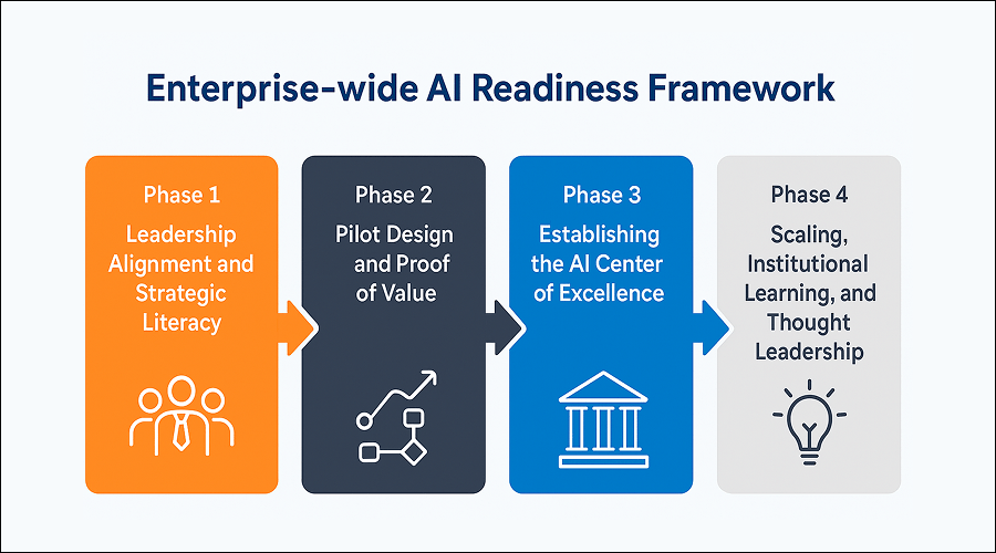 The framework builds capability in four progressive phases, each designed to convert learning into measurable value.